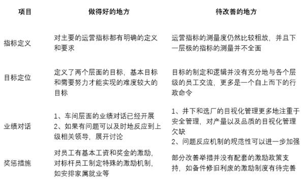 該銅礦目前已經建立了一套完整的業績管理體系,然而在指標的精確衡量,目標的溝通,以及業績對話和獎懲機制上仍有一定的提升空間項目做得好的地方待改善的地方